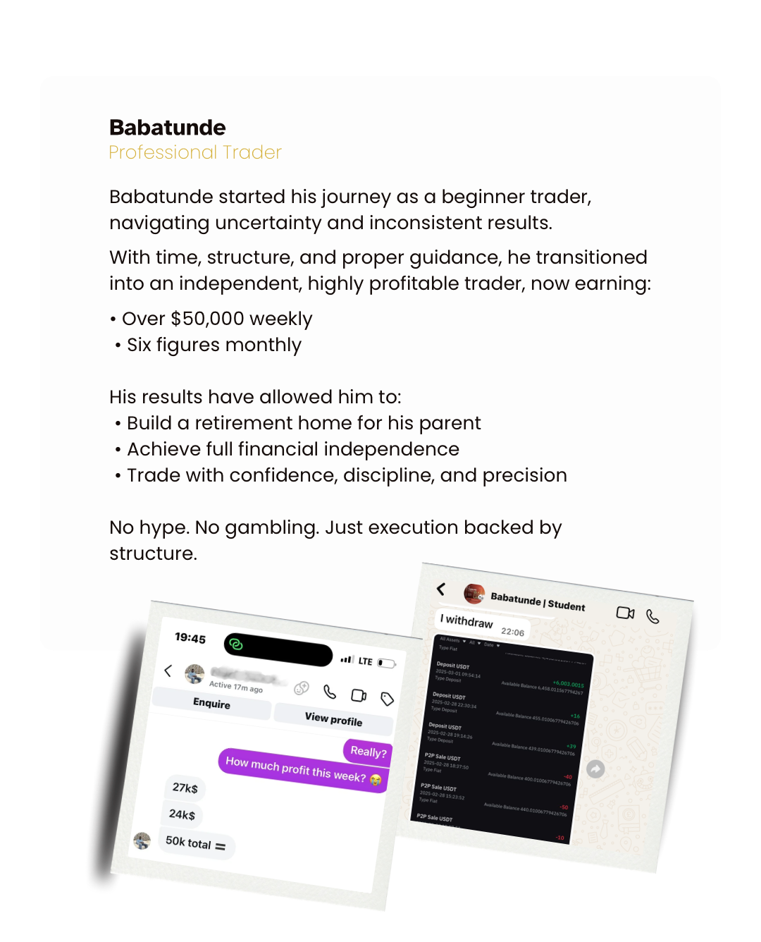 You receive structure, guidance, accountability, and systems — so you understand why trades or strategies work, not just what to copy.
